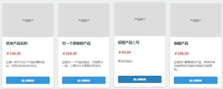 <div class="product-card"> <div class="product-image">产品图片</div> <div class="product-info"> <h3 class="product-title">超级产品三号</h3> <p class="product-price">¥99.00</p> <p class="product-description">简洁的描述。</p> <button class="add-to-cart-btn">加入购物车</button> </div> </div>