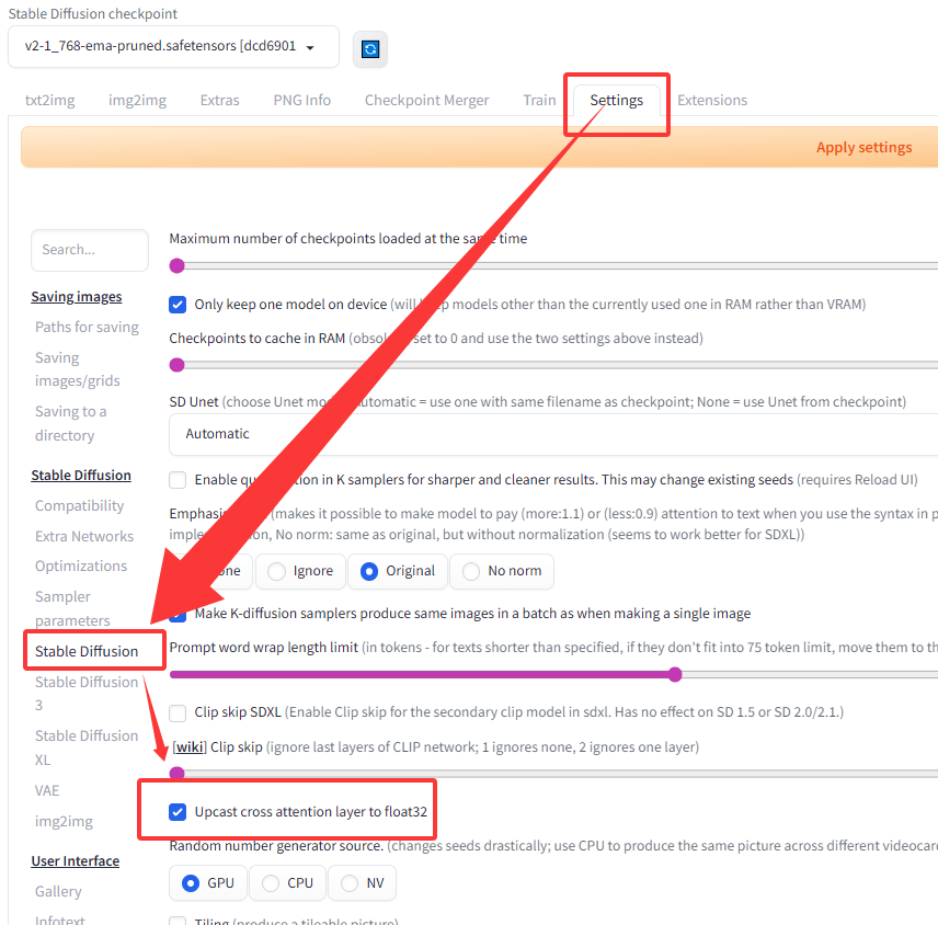 注意如果有报错,需要设置一下: modules.devices.NansException: A tensor with NaNs was produced in Unet. This could be either because there's not enough precision to represent the picture, or because your video card does not support half type. Try setting the "Upcast cross attention layer to float32" option in Settings > Stable Diffusion or using the --no-half commandline argument to fix this. Use --disable-nan-check commandline argument to disable this check.