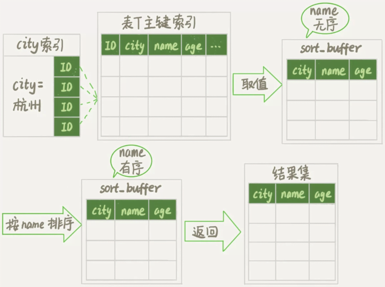 select city,name,age from t where city='杭州' order by name limit 1000  ;