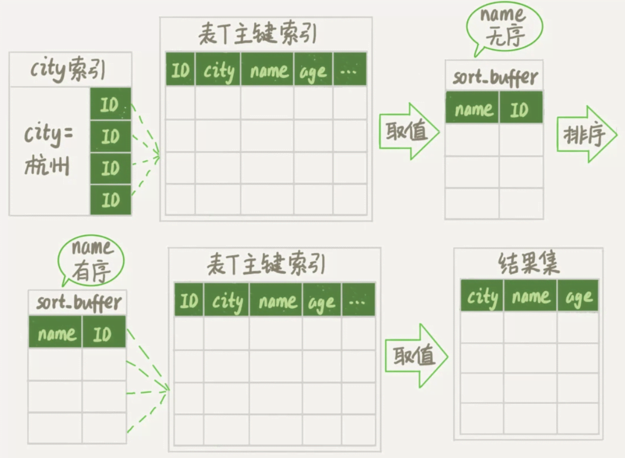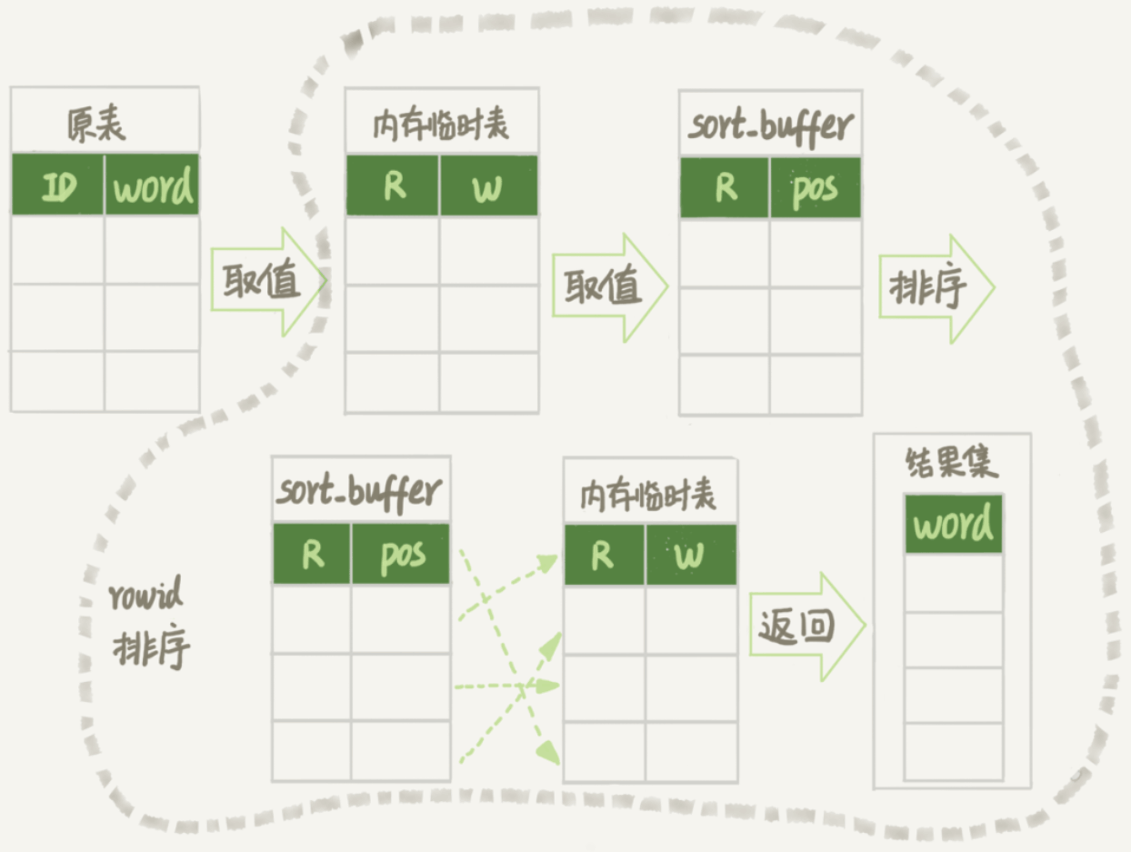 为了更好地分析,这里引用上一篇文章中全字段排序和rowid排序的流程图: