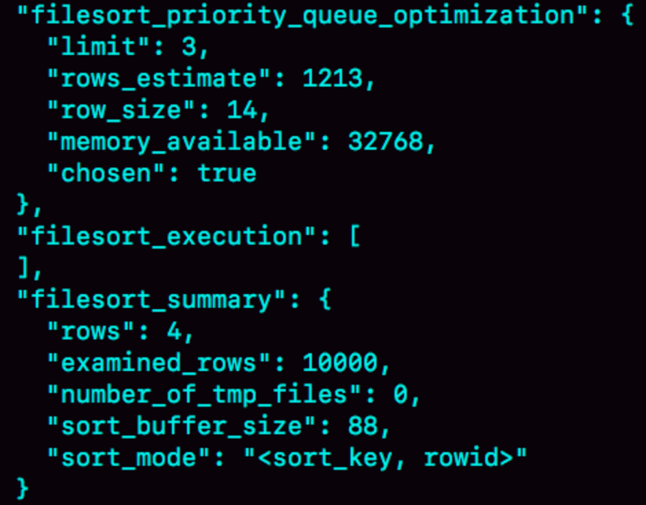 当使用磁盘临时表,对应是一个没有显式索引的InnoDB表的排序过程。这里把tmp_table_size设为1024,sort_buffer_size设为32768,max_length_for_sort_data设为16,查看OPTIMIZER_TRACE,得到部分结果如下: