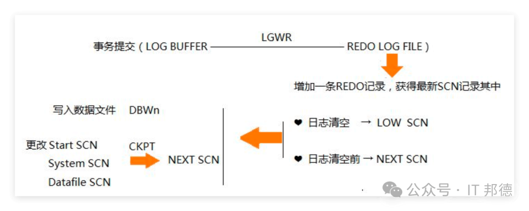 SCN是Oracle内部的一个递增数字,用于唯一标识数据库的变更顺序,今天小编就带大家一起扒拉下CSN的核心机制。 相对我们人类用世纪、年月日、时分秒计时而言,SCN就相当于ORACLE的计时方法。SCN是一个数字,确切的说是一个只会增加、不会减少的数字。正是它这种只会增加的特 性确保了Oracle知道哪些应该被恢复、哪些应该被复制。 1.数据变化是如何写入数据文件![]() 1.事务开始; 2.在BUFFER CACHE中寻找需要的数据块,如果没有,则从数据文件读入数据块; 3.生成重做项写入REDO LOG BUFFER(重做日志缓冲区)中,修改BUFFER CACHE(数据库高速缓冲区),该区域被标识为“脏缓冲区”; 4.事务提交,LGWR进程将LOG BUFFER中的重做记录写入ONLINE REDO LOG FILE(联机重做日志文件)中; 5.当发生CHECKPOINT,CKPT进程更新所有数据库文件头的信息,DBWn进程将 BUFFER CACHE中的脏数据写入DATA FILE中。 2.SCN的变化历程2.1 系统最新SCN2.2 系统检查点SCN当checkpoin(检查点)完成后,ORACLE 将System Checkpoint SCN号(系统检查点SCN)存放在控制文件中。 2.3 数据文件检查点SCN当checkpoint完成后,ORACLE 将Datafile Checkpoint SCN 号存放在控制文件中。 2.4 Start SCNORACLE 将Start SCN号存放在数据文件头中。 这个 SCN 用于检查数据库启动过程是否需要做media recovery(介质恢复). 介质恢复(Media Recovery)是在数据文件本身不一致(通常是由于物理损坏或从备份还原)时,需要人工干预的恢复过程,它利用备份、归档重做日志和在线重做日志将数据文件修复到事务一致的状态。 ![]() ![]() 2.5 Stop SCNORACLE 将Stop SCN 号存放在控制文件中。 这个 SCN 号用于检查数据库启动过程是否需要做instance recovery(实例恢复)。 ![]() 实例恢复(Instance Recovery),它发生在数据库实例异常关闭(如断电)后。此时,数据文件本身是完整的,但可能有一部分已提交事务的更改还留在内存中未来得及写入数据文件(需要前滚),也可能有一部分未提交事务的更改已写入数据文件(需要回滚)。实例恢复是Oracle实例自动完成的,不需要DBA干预。 3.网友问答针对以上问题,我回答网友们的以下问答哈! 3.1 SCN 的变化机制是?记录日志时,自动记录最新的 SCN 到日志中。因此,每一条日志都包含了一个时间。 当 DBWn 进程启动时,将依照日志记录写入一段数据。这一段日志记录的时间段必定有一个最早时间和一个最新(迟)时间。最早的时间我们称为 LOW SCN(即上次清空日志后的 第一条记录),最新时间我们称为 NEXT SCN(即下次日志清空前的最近一条记录)。 这 里 ,由 CKPT 进 程 将 NEXT SCN 的 值 同 步 更 新 到 START SCN 、 SYSTEM CHECKPOINT SCN 和 DATAFILE CHECKPOINT SCN 中,以确保所有文件的一致性。 ![]() 3.2 最新的 SCN 如何生成?系统是如何产生一个最新的SCN的?实际上,这个数字是由当时的timestamp转换过来的。每当需要产生一个最新的SCN到redo记录时,系统获取当时的timestamp,将其转换为 数字作为SCN。 3.3 SCN号与数据库启动的关系