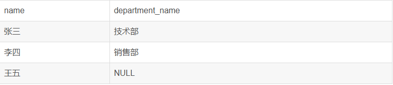 注意:员工“王五”的department_id为NULL,在部门表中找不到匹配项,所以没有出现。部门“市场部”在员工表中没有对应的员工,所以也没有出现。