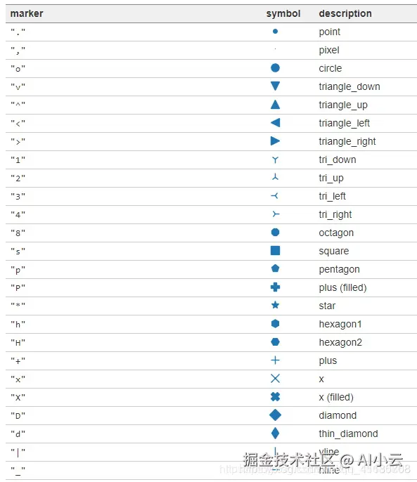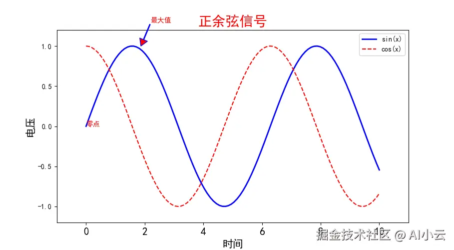 4、绘制子图一个绘图对象可以包含多个轴,在matplotlib中用轴表示一个绘图区域,可以将其理解为子图。不特别指定,绘图对象只包括一个轴,因此只显示了一个轴(子图Axes)。 可以使用fig对象的add_subplot方法和plt.subplot方法绘制多个轴的图表。 5、添加说明和注释添加文字说明主要用到方法text,注释可以使用annotate方法。 import matplotlib.pyplot as plt from pylab import mpl import numpy as np mpl.rcParams["font.sans-serif"] = ["SimHei"] mpl.rcParams["axes.unicode_minus"] = False x = np.linspace(0, 10, 100) # 0到10之间的所有数据,分成100个组 y = np.sin(x) z = np.cos(x) # 绘图设置 plt.figure(figsize=(8, 5), dpi=100) # 宽度和高度(英寸),dpi,每英寸像素值 plt.title('正余弦信号', color='red', fontsize=20, rotation=0, alpha=1) # 添加标题,rotation角度旋转,alpha透明度 plt.xlabel('时间', fontsize=15, color='k', rotation=0) ## 设置x和y轴的名称 plt.ylabel('电压', fontsize=15) plt.xlim(-1, 11) # 设置x和y轴的范围 plt.ylim(-1.2, 1.2) plt.xticks(np.arange(0, 12, 2), fontsize=15, rotation=0) # 设置x和y周的刻度 plt.yticks([-1, -0.5, 0, 0.5, 1]) plt.plot(x, y, color='blue', linewidth=2, label='sin(x)') # 绘图 plt.plot(x, z, 'r--', label='cos(x)') # r红色,--表示线型 plt.legend(loc=0) # 添加文字说明。0,0表示文字的坐标位置 plt.text(0, 0, '零点', fontsize=10, rotation=0, color='r') # 添加注释。xy指要添加注释的点,xytext是指注释文字的位置,可以自由指定。也可以添加多个注释 plt.annotate('最大值', color='r', xy=(1.87, 1), xytext=(2.2, 1.3), arrowprops=dict(facecolor='r', edgecolor='b', width=1, headlength=10)) plt.show()