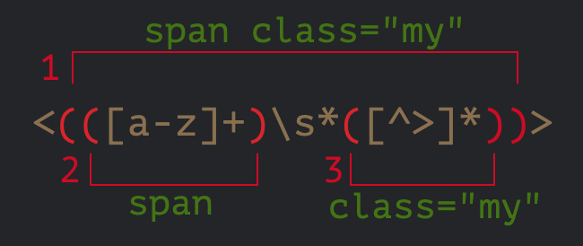 验证: let str = '<span class="my">'; let regexp = /<(([a-z]+)\s*([^>]*))>/; let result = str.match(regexp); alert(result[0]); // <span class="my"> alert(result[1]); // span class="my" alert(result[2]); // span alert(result[3]); // class="my"