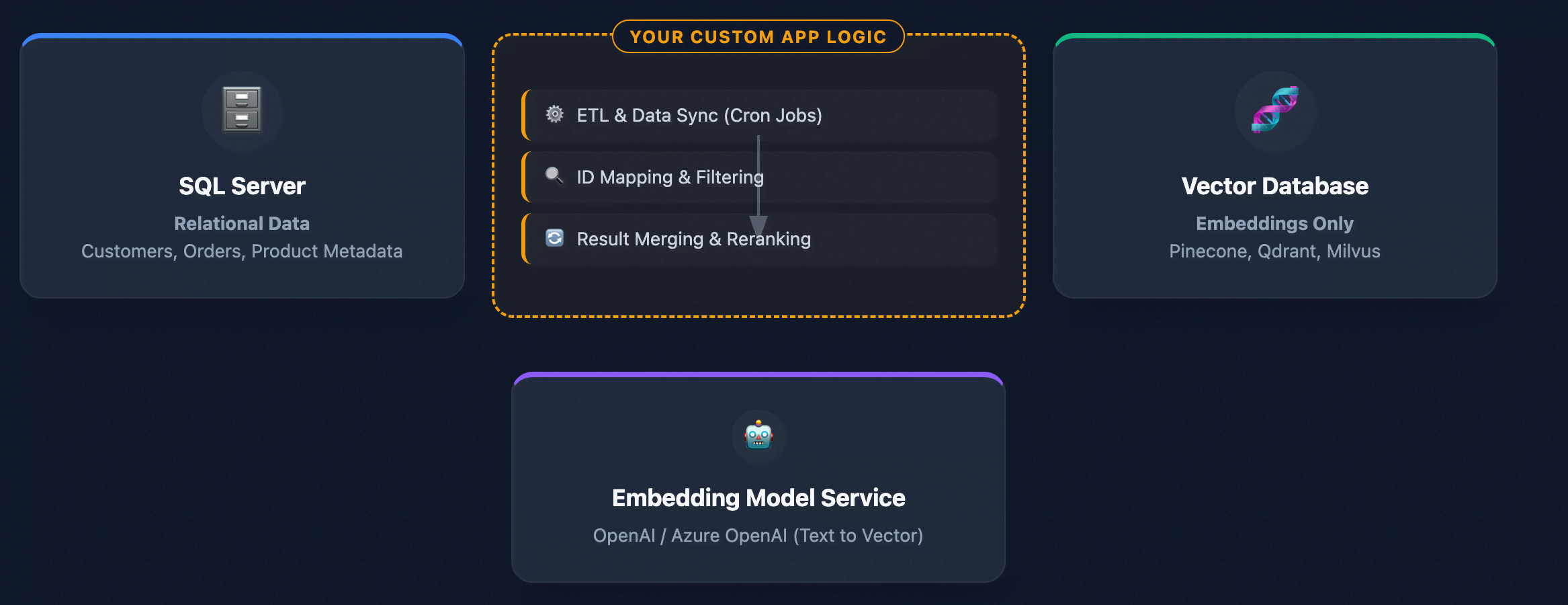 该图中可以看到,做一个简单的RAG程序,需要从SQL Server中捞出数据,调用外部模型进行文本切块,向量嵌入,然后将数据再存储到外部的向量数据库中,例如Milvus 整个程序的编排过程需要考虑数据同步、数据安全、数据一致性问题、同时还要考虑数据安全与隔离等问题。
