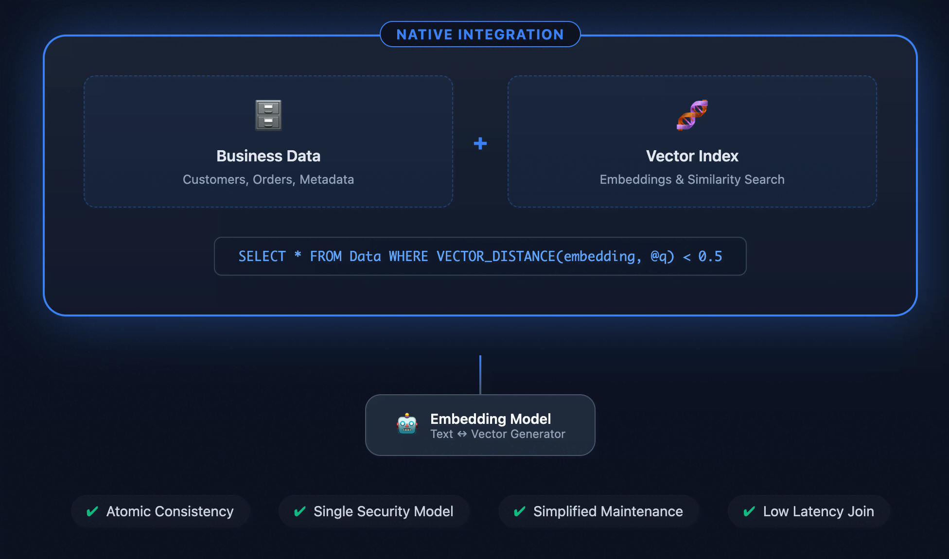 图:有向量支持之后的SQL Server 2025 而使用内置的向量类型+语义搜索,所有操作都可以集中在SQL Server中完成。
