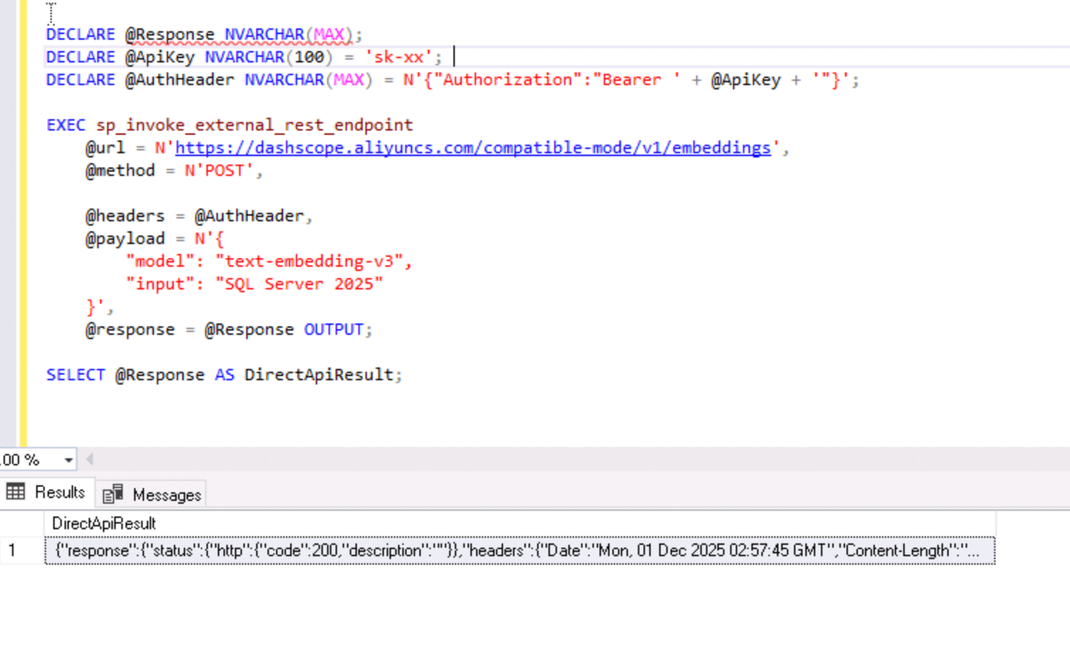 CREATE EXTERNAL MODELSQL Server 2025 引入了 CREATE EXTERNAL MODEL 语句,用于简化对于Text Embedding 模型的调用,该语句用于注册AI模型的元数据,下层依然依赖sp_invoke_external_rest_endpoint 存储过程。 但该功能在国内相对受限,该函数会强制检查api.openai.com域名,只有该域名才能够发送Authorization这个HTTP头,因此与国内的很多第三方模型并不兼容,第三方的使用方式依然需要依赖sp_invoke_external_rest_endpoint进行更low level的调用。 实际使用时,先定义模型,如下: 典型的使用主要是两个函数: