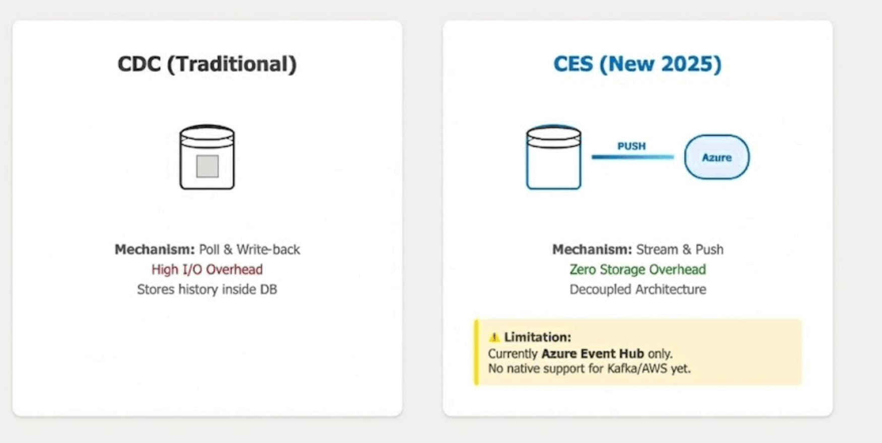 说到CES不得不提一下CDC,CDC属于一个业界标准的变更捕获工具,由SQL Server 2008开始引入,对于该功能,我有点一言难尽,该功能的本质并不是集成在内核中,而是依赖一系列系统存储过程,系统表以及SQL Server Agent作业 的 LogReader 作业读取事务日志完成,复杂度和IO负载开销非常高,我做过这么多年SQL Server依然不敢保证能解决所有的CDC相关问题。 而CES工作原理是不再把变更数据写回本地数据库,而是直接从内存或日志中截获变更,打包成标准事件,推送到外部。带来的好处是不需要在数据库内维护巨大的系统变更表,大幅减少 I/O。下游消费者(如实时数仓、微服务)直接订阅消息队列,完全不需要触碰生产数据库。同时获取近乎实时的数据流传输。 虽然 CES 在协议层面上宣称支持 AMQP 和 Kafka 协议,但在 SQL Server 2025 的当前预览版和微软的官方支持路径中,它主要且唯一支持的目标端点是 Azure Event Hubs (Azure 事件中心)。 在国内公有云场景下,当前更成熟、可落地的路径依然是“SQL Server CDC + 阿里云 DTS/消息队列”的组合:由数据库负责变更捕获,由 DTS 或自建消费程序转发到 Kafka、数据湖或实时数仓。未来如果 CES 对第三方云平台开放Endpoint,我们也会评估如何在 RDS 中提供托管级的一键配置能力。