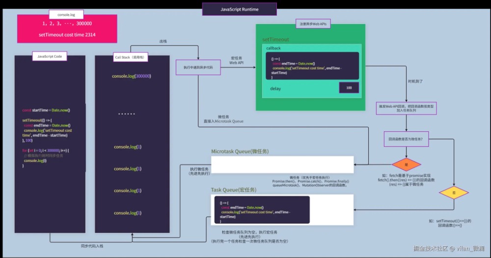 下图当前Call Stack执行栈执行完同步代码后,由于fetch和setTimeout都是宏任务,所以走宏任务Web API流程后注册这两个事件回调,等待定时到后了,由于定时回调是个普通的同步函数,所以放到宏任务队列;等待fetch拿到服务器响应数据后,由于fetch回调为一个Promise对象,所以放到微任务队列。