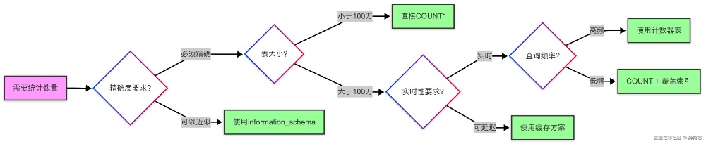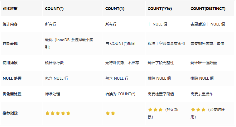 结论:COUNT(*)和 COUNT(1)性能基本一致,COUNT(非索引列)性能最差。 存储引擎差异与索引统计不同存储引擎对 COUNT 的处理方式差异很大: