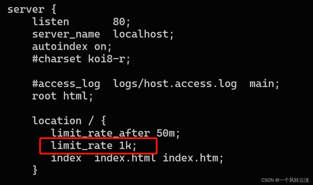 如果同时配置了sendfile_max_chunk 指令,按照两者较小的数值进行带宽控制。 实战测试location / { limit_rate 1k; root html; }