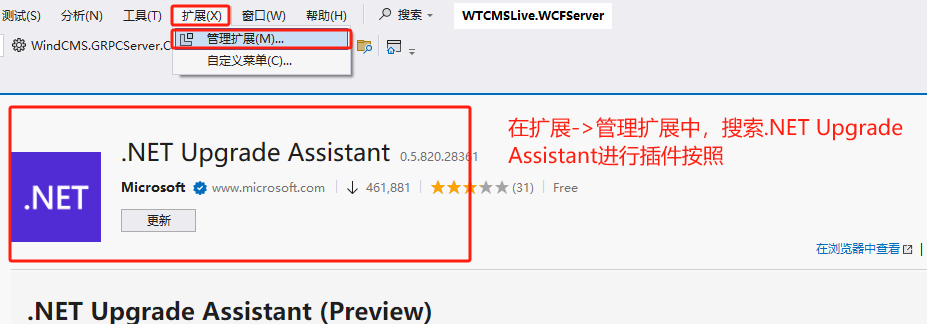 之前项目使用的是.NET Framework 4.7.2的框架,现在需要升级到.Net 6。这里需要借助于VS 2022中的.NET Upgrade Assistant插件。具体是在VS 2022中的扩展中进行安装。
