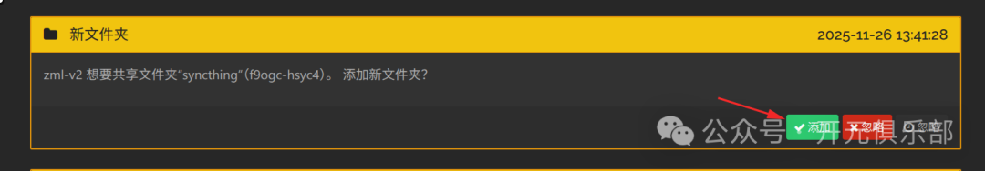 /data/backup。 - • 保存后,B 的界面会弹出一个提示“A 想要共享文件夹”,点击“添加”,设置好 B 本地的路径即可。