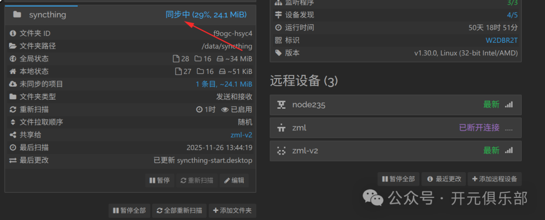 调整后,检查 Syncthing 是否恢复正常: