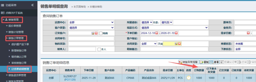答:首先可以在系统菜单内的“销售管理”》“销售订单管理”》“订货单明细管理”中确认当前新增的销售单的订购数量和待发货量。