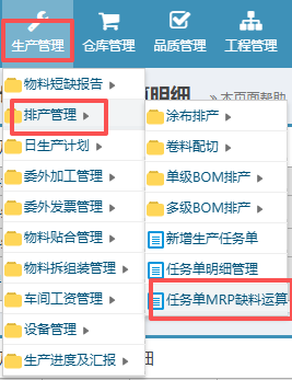 确认之后,根据已有的生产工单(如没有的话可以先新增生产任务单),在菜单栏上找到“生产管理”》“排产管理”》“任务单MRP缺料运算”进入