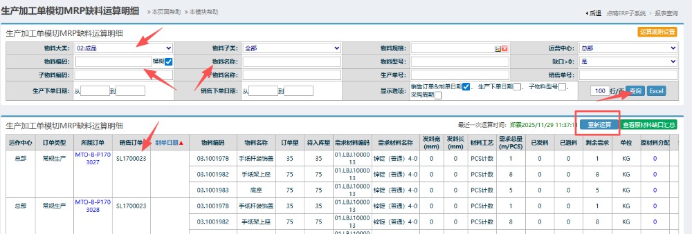 进入界面后,根据需要查询物料信息填写对应的编码或者名字进行筛选,在下方找到对应关联的销售订单的物料信息,通过点击右上“重新运算”