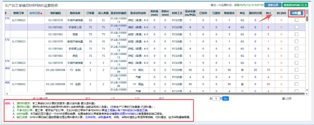 运算完毕后就会得到相应的物料运算结果,找到对应订单查看当前的一个缺料和缺口情况,根据情况了解该物料目前库存是否充足。