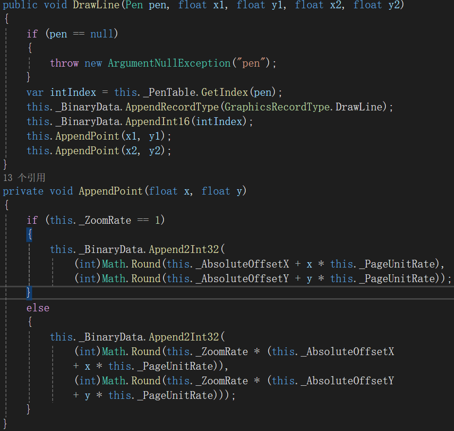 在各个绘图函数内部,会将绘图指定和使用的参数值转储到一个内存字节流中。比如对于DrawLine()其代码如下: