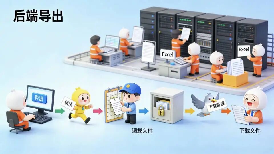 在我们的项目中,我们同时使用了前端导出和后端导出两种方案,它们各自有不同的适用场景和优势。下面是对两种方案的详细对比和选择建议: