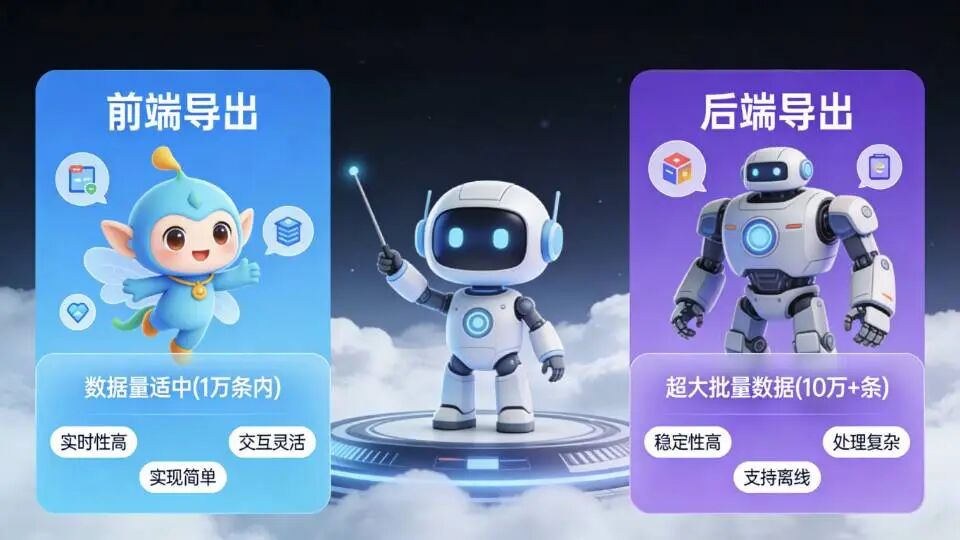 面对大数据量导出的挑战,我们采取了"双管齐下"的策略:一方面对前端导出进行性能优化,另一方面引入后端导出作为补充方案。通过智能分流机制,根据数据量和使用场景自动选择最适合的导出方式。