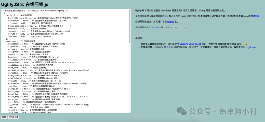在这里,我使用了 UglifyJS 。它也会智能将代码里的多余的地方优化,以实现尽可能小的体积: