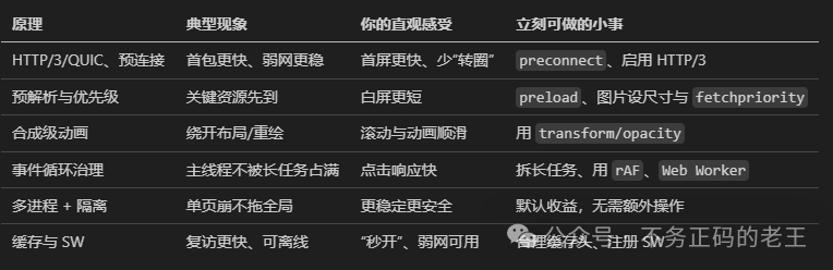 transform/opacity 可走合成级动画,避开昂贵的重排/重绘。 - 举个栗子:先摆家具(布局),再上色(绘制),最后在舞台灯光下把布景叠起来(合成)。
