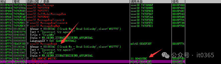 00401585 |> \8D4D E4 lea ecx,[local.7]00401588 |. 51 push ecx ; /String2 = "<BrD-SoB>"00401589 |. 8D55 F4 lea edx,[local.3] ; |0040158C |. 52 push edx ; |String1 = "gzh:it036"0040158D |. FF15 00204000 call dword ptr ds:[<&KERNEL32.lstrcmpA>] ; \lstrcmpA00401593 |. 85C0 test eax,eax00401595 |. 7516 jnz short 11.004015AD00401597 |. 6A 40 push 0x4000401599 |. 6850304000 push 11.00403050 ; ASCII "CrackMe"0040159E |. 6858304000 push 11.00403058 ; ASCII "Correct way to go!!"004015A3 |. 8B4D E0 mov ecx,[local.8]004015A6 |. E8 53050000 call <jmp.&MFC42.#4224>