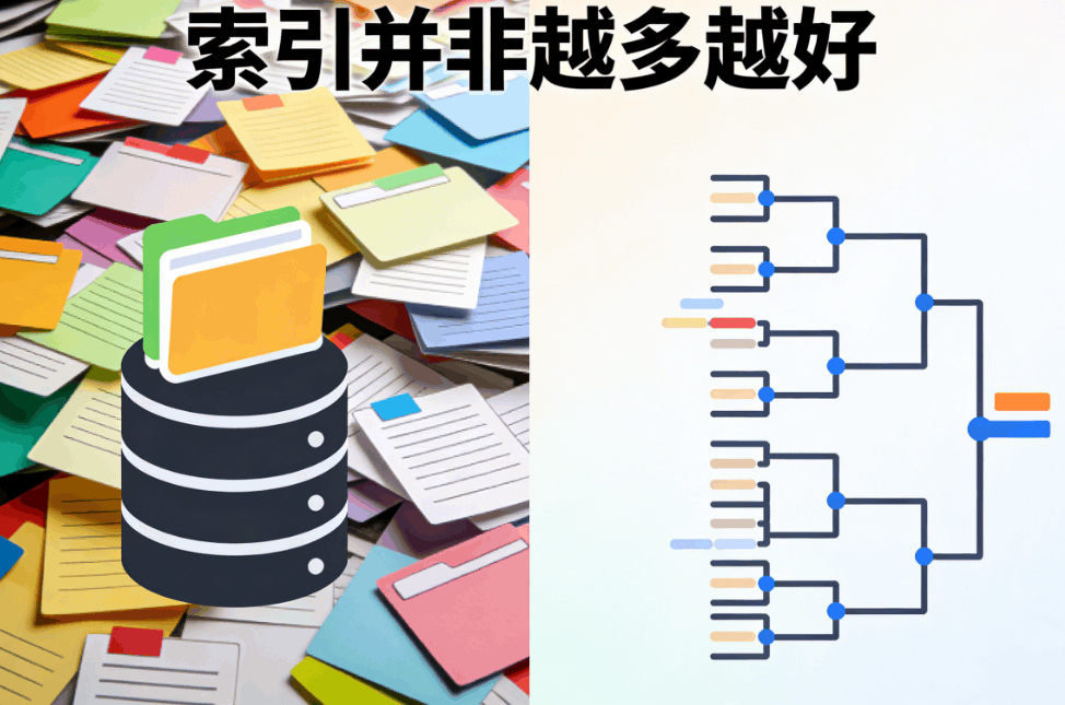 注意:这里用了数字 789012,而不是字符串 '789012'。 MySQL 为了比较,会把表中所有 user_id 转成数字。结果是进行了全表扫描!800万行,每次登录都要扫一遍。改回字符串后,响应时间从 6.3 秒降到 8 毫秒。 另外,隐式转换的案例还有很多,例如字符集不同、排序规则不同等也会造成。所以需要谨记索引不是贴上去就生效,它很“娇气”——函数、类型不匹配、最左前缀破坏,都会让它“罢工”。 误区2:“查询字段都建索引,索引越多越好”