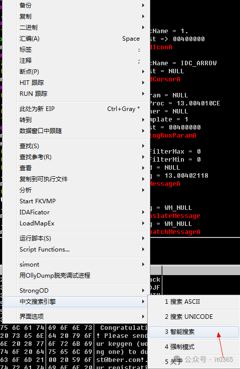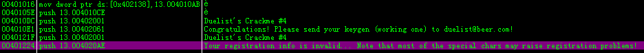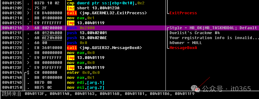 由这里可以判断的数字转成字母得出用户名只能是大小写字母。将用户名修改下继续分析。004011A4 . 83F8 00 cmp eax,0x0 ; Switch (cases 0..7A)004011A7 . 74 32 je short 13.004011DB004011A9 . BE FFFFFFFF mov esi,-0x1004011AE . 83F8 41 cmp eax,0x41004011B1 . 7C 67 jl short 13.0040121A004011B3 . 83F8 7A cmp eax,0x7A004011B6 . 77 62 ja short 13.0040121A004011B8 . 83F8 5A cmp eax,0x5A004011BB . 7C 03 jl short 13.004011C0004011BD . 83E8 20 sub eax,0x20 ; Cases 5A ('Z'),5B ('['),5C ('\'),5D (']'),5E ('^'),5F ('_'),60 ('`'),61 ('a'),62 ('b'),63 ('c'),64 ('d'),65 ('e'),66 ('f'),67 ('g'),68 ('h'),69 ('i'),6A ('j'),6B ('k'),6C ('l'),6D ('m')... of switch 004011A4004011C0 > 46 inc esi ; Cases 41 ('A'),42 ('B'),43 ('C'),44 ('D'),45 ('E'),46 ('F'),47 ('G'),48 ('H'),49 ('I'),4A ('J'),4B ('K'),4C ('L'),4D ('M'),4E ('N'),4F ('O'),50 ('P'),51 ('Q'),52 ('R'),53 ('S'),54 ('T')... of switch 004011A4004011C1 . 0FBE96 172040>movsx edx,byte ptr ds:[esi+0x402017]004011C8 . 3BC2 cmp eax,edx004011CA .^ 75 F4 jnz short 13.004011C0004011CC . 0FBE86 3C2040>movsx eax,byte ptr ds:[esi+0x40203C]004011D3 . 8981 94214000 mov dword ptr ds:[ecx+0x402194],eax004011D9 .^ EB C1 jmp short 13.0040119C004011DB > FF35 AF214000 push dword ptr ds:[0x4021AF] ; Case 0 of switch 004011A4004011E1 . 68 94214000 push 13.00402194 ; ASCII "8DFF0F7"004011E6 . 68 79214000 push 13.00402179 ; ASCII "12345678"004011EB . E8 54000000 call 13.00401244
