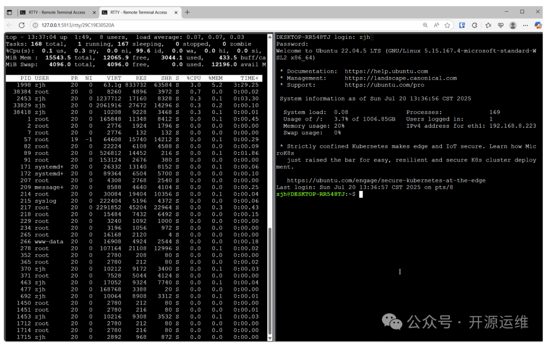 核心功能网页终端 不用装任何软件,打开浏览器就能用。终端功能完整,支持快捷键和分屏,响应速度很快,操作体验接近本地SSH