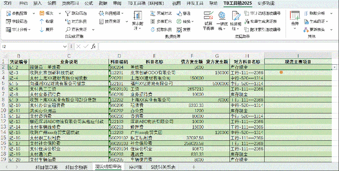 通过序时账生成现金流量表,其实很简单! 一、主要思路 1.首先,通过序时账筛选出库存现金和银行存款涉及的分录,进而获取现流明细表; 2.接着,在现流明细表增加一列,根据业务性质判断并填充每一笔明细对应的现流主表项目; 3.最后,按主表项目汇总金额,即可生成现金流量表。 为了进一步提升审计效率,“TB工具箱”提供了一套完整、系统的解决方案,帮助您快速、准确地完成现金流量表编制。 二、操作指南 1.获取现流明细表 可以展开“科目明细”下拉菜单,点击“科目明细账”;在弹出的对话框,输入100,即可从序时账获取1001库存现金和1002银行存款的全部分录。