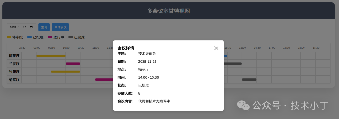 控制面板位于页面顶部,提供日期选择和基本操作按钮。这个区域允许用户选择查看的日期,并提供了申请会议的按钮。 <div class="controls"> <input type="date" id="dateInp"> <button onclick="search()">查询</button> <button onclick="openApplyModal()">申请会议</button></div>