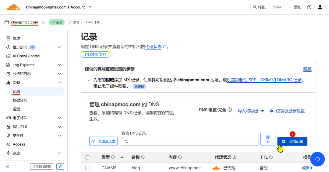- 6. 开始DNS解析记录操作,依次点击主页>DNS记录>添加记录