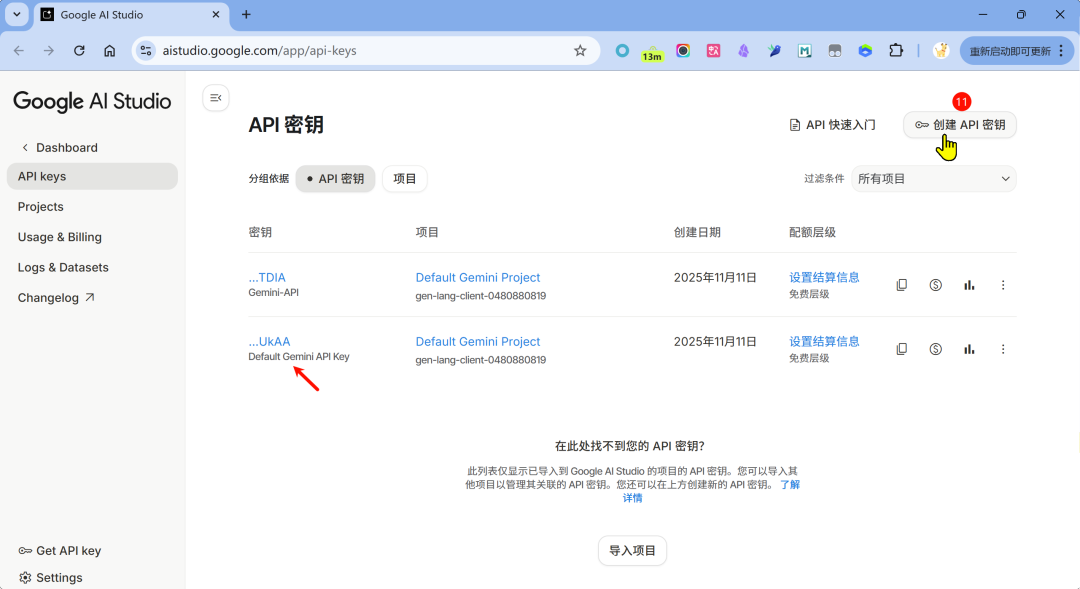- 8. 生成Google AI的API密钥,需要梯子。 Gemini Pro的api key获取地址:https://makersuite.google.com/app/apikey