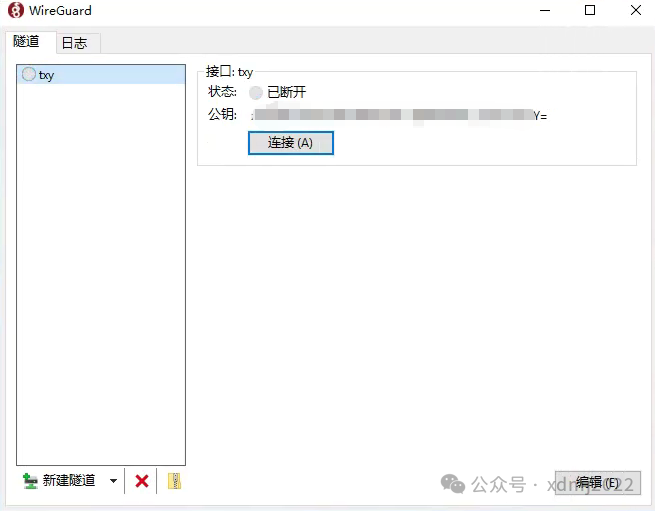 在 WireGuard GUI 中点击"Add Tunnel" → "Create new tunnel",系统会自动生成密钥对。