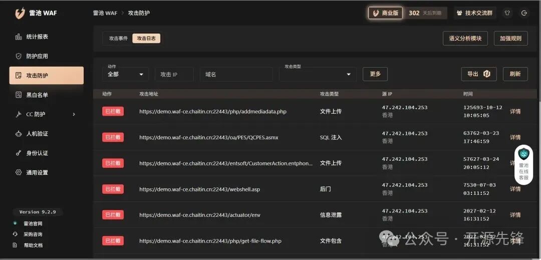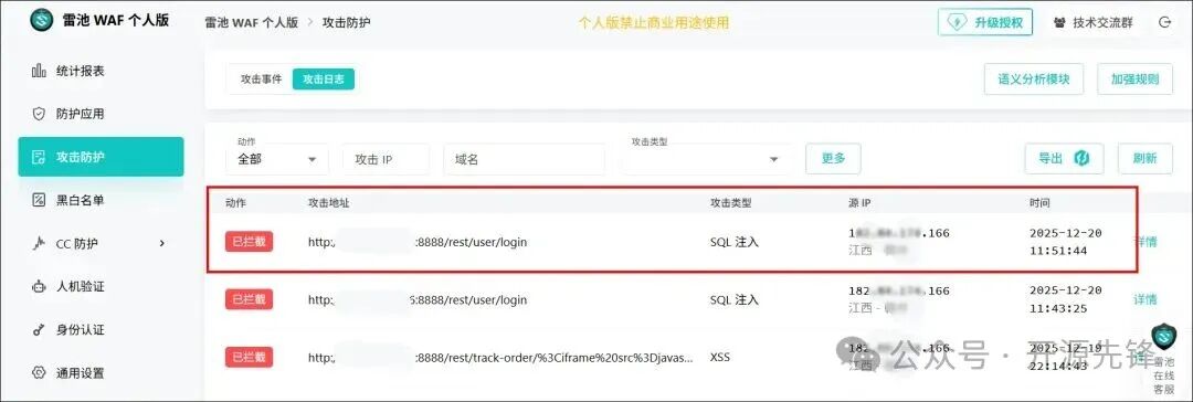 我们来到雷池管理后台,从攻击日志中可以看到刚刚这笔被拦截的攻击记录 以及具体详细信息 场景2:API 接口直接“拖库”,数据被窃取如果说第一个场景是“闯进系统”,那第二个场景展示的就是 闯进来之后能拿走什么 。 开源君构建的这个web页面的搜索 API 本身存在 SQL 注入风险。在 3000 端口下,通过构造查询参数,让接口返回的内容不再是商品数据,而是数据库里的真实用户的信息,账号、密码都被扒出来了。