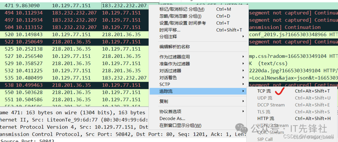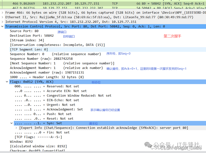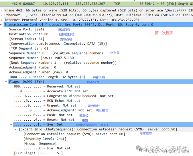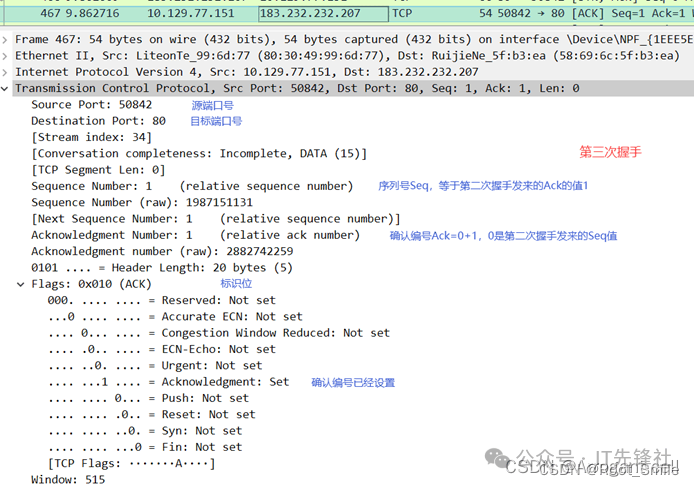 ![]() ![]() ![]() ![]() ![]() ![]() 2.捕获选项设置点击 捕获-->选项,取消勾选“在所有接口上使用混杂模式”,为了方便后续的抓包分析并排除干扰项,您可以选择安装自己所需的网卡,比如WLAN,然后点击确认完成此操作;当然,此步骤并非强制执行,您可以根据个人需求来决定是否执行。 ![]() 3.抓包分析ARP (Address Resolution Protocol)协议,即地址解析协议。该协议的功能就是将IP地址解析成MAC地址。 接下来,我们可以通过命令提示符(cmd)来执行ping操作,向一个指定的IP地址发送数据包。为了便于测试网络的连通性,我们通常建议选择同一局域网内的IP地址进行测试。但在此示例中,为了展示如何使用该命令,我们将以ping www.douyin.com 为例进行操作,具体步骤如下: ![]() Wireshark中arp协议的解析: ![]() ![]() ![]() ![]() 4.IP协议抓包分析互联网协议IP是Internet Protocol的缩写,中文缩写为“网协”。IP协议是位于OSI模型中第三层的协议,其主要目的就是使得网络间能够互联通信。前面介绍了ARP协议,该协议用在第二层处理单一网络中的通信。与与此类似,第三层在功能上承担着跨网络通信地址的管理职责。在这一层级中,多种协议并行工作,其中最为广泛使用且至关重要的协议便是互联网协议(IP)。 ![]() 在Wireshark中,我们已经成功捕获了相当数量的数据包,接下来可以通过应用过滤器 ![]() ip协议抓包分析 ![]() 在所述内容中,Internet Control Message Protocol 通常被称为 ICMP 协议,用于描述相关的协议数据包信息。 ![]() ![]() 5.TCP协议抓包分析TCP (Transmission Control Protocol,传输控制协议)它是一种以连接为导向、具备高度可靠性以及基于IP协议的传输层协议。其核心宗旨在于为数据传输建立可靠的端到端通道。TCP协议在RFC793文档中被详细规定,并且在OSI参考模型中运行于第四层。该协议不仅能够有效管理数据的传输顺序,还能够执行错误恢复机制,最终确保数据能够准确无误地送达目的地。但是,该协议的过程比较复杂。 TCP三次握手 ![]() 1.第一次握手 (1)服务器收到了客户端的请求,向客户端回复一个确认信息(Ack=x+1)。 3.第三次握手 TCP四次挥手 ![]() 为了捕获网络数据包,我们首先需要启动Wireshark软件。如果初始状态下没有数据显示任何数据包,可以通过在浏览器中加载一个网页来触发数据流。例如,可以访问百度首页,点击新闻分类下的某个链接以打开一个新闻页面,随后关闭该页面。此时,在Wireshark中应该能够捕获到大量的网络数据。为了更精确地查看HTTP相关的数据,可以在Wireshark的过滤器栏中输入"http"作为过滤条件。 ![]() 选中一个http记录,右键—>追踪—>tcp流,即可看到一个完整的tcp三次握手。 ![]() 完整的TCP三次握手如下: ![]() TCP协议抓包包分析: ![]() ![]() 第二次和第三次握手的字段内容与第一次握手的字段内容大体一致,主要的差异在于Ack和Seq这两个字段的取值有所不同。 ![]() ![]() ![]() ![]() TCP协议的四次挥手过程与三次握手阶段在基本原理上具有相似性,我们可以利用过滤器 tcp.flags.fin==1 来定位识别出用于发起挥手动作的数据包。 ![]() 为了分析端口号有来有回的数据包,我们将首先监控并捕获这些数据包,然后利用过滤器 tcp.port==50788 对捕获到的数据包进行筛选,最终目的是找出并识别出完整的四次挥手过程。 ![]() 6.UDP协议抓包分析UDP是User Datagram Protocol (用户数据报协议)的简称。它是OSI七层模型中一种无连接的传输层协议,提供面向事务的简单的不可靠信息传送服务。 ![]() ![]() 7.ICMP协议抓包分析ICMP (Internet Control Message Protocol,网际报文控制协议)是Internet 协议族的核心协议之一,它主要用在网络计算机的操作系统中发送出错信息。例如,提示请求的服务不可用、主机或者路由不可达。ICMP协议依靠IP协议来完成其任务,通常也是P协议的一个集成部分。ICMP协议和TCP或UDP协议的目的不同,它一般不用来在端系统之间传送数据。它通常不被用户网络程序直接使用,或者是像Ping 和 tracert这样的诊断程序。 进行抓包,启动Wireshark,通过cmd命令ping一个ip,如ping www.douyin.com。 ![]() 回到Wireshark中利用过滤器输入icmp进行筛选即可,分析如下: ![]() ![]() ![]() ![]()
