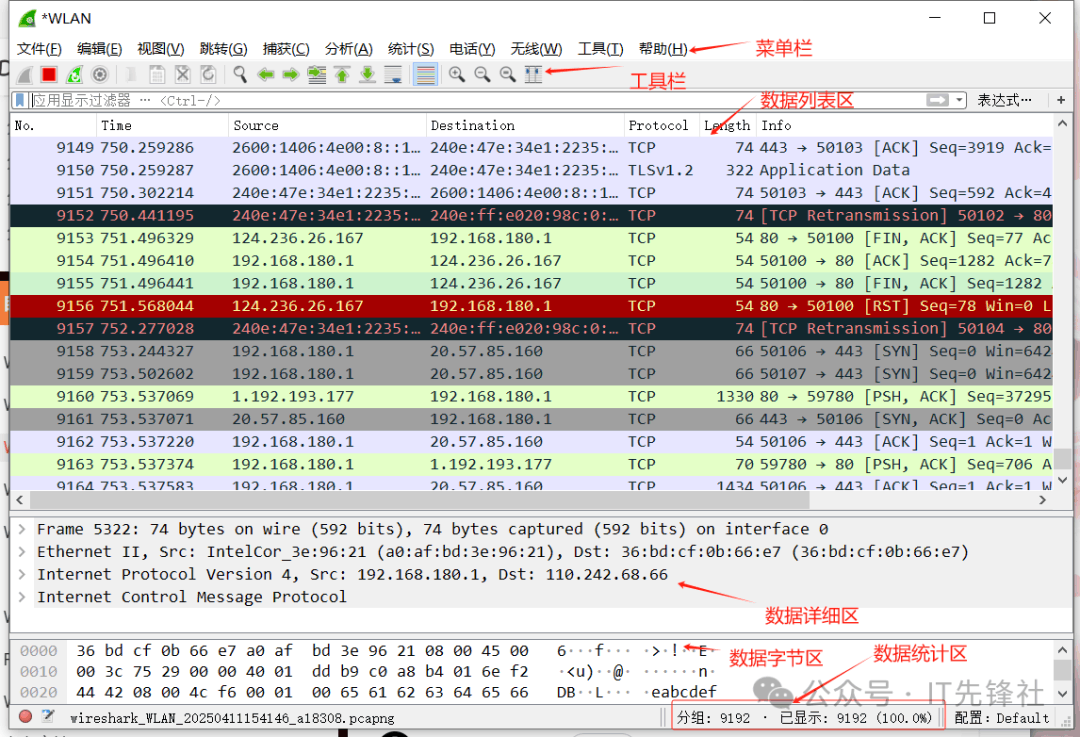 2. Packet List Pane(数据包列表), 显示捕获到的数据包,每个数据包包含编号,时间戳,源地址,目标地址,协议,长度,以及数据包信息。 不同协议的数据包使用了不同的颜色区分显示。