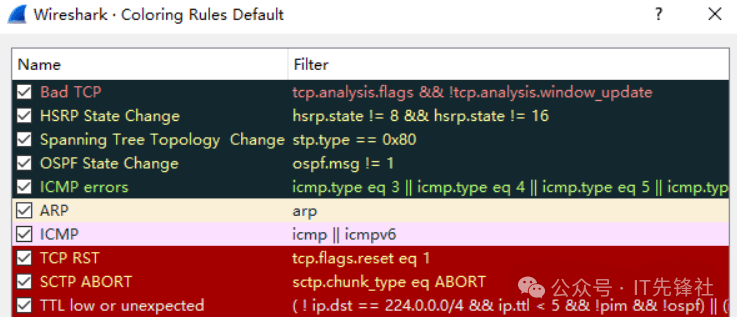 说明:数据包列表区中不同的协议使用了不同的颜色区分。协议颜色标识定位在菜单栏View --> Coloring Rules。如下所示