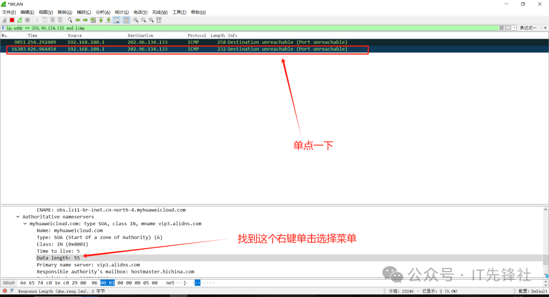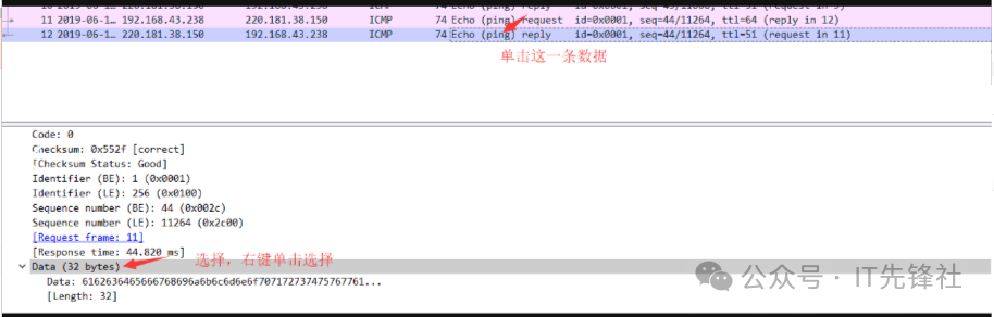(7)按照数据包内容过滤。假设我要以IMCP层中的内容进行过滤,可以单击选中界面中的码流,在下方进行选中数据。如下