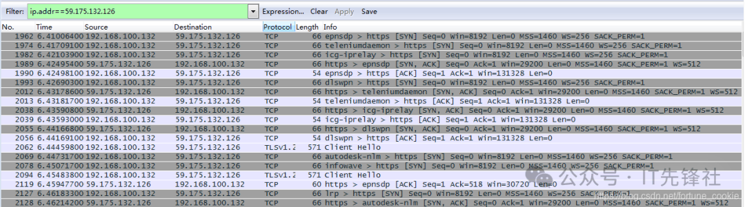 (2)打开命在工具栏上的Filter对话框中填入过滤条件: ip.addr==59.175.132.126,过滤结果如下: