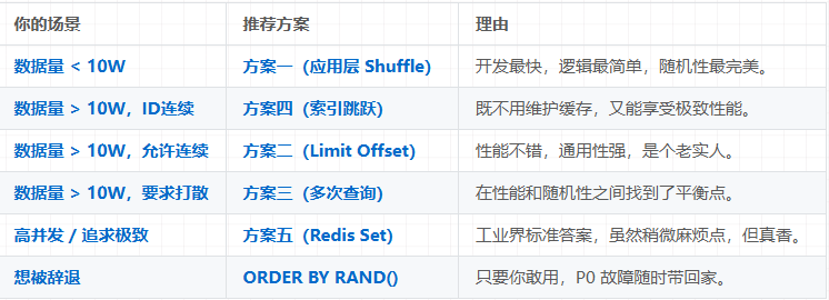 方案二:Limit 偏移法(Limit Offset) 适用场景:数据量大(百万级以上),对随机性要求没那么严苛。 核心思想:给所有数据编个号,随机生成一个“偏移量”,直接跳到那里去拿。 代码实现优缺点点评