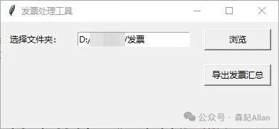 一个窗口,两行控件: 第一行:提示文字 + 输入框 + “浏览”按钮。 第二行:“导出发票汇总”按钮。