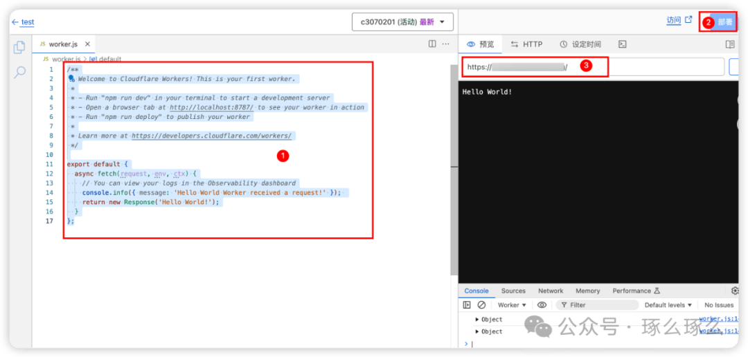 这里需要注意,添加的自定义域名最好是顶级域名,尽量不要使用子域名,因为cloudflare可能不会识别子域名或者视子域名为别人域名而导致回调不成功,不能正确使用功能。域和路由添加完成后,要测试域名(5)是否可以正确显示Hello World!选择文本类型,设置变量名称和值,值是uuid,可以使用在线生成一个,这里的uuid要记住,后面运行时要使用。添加完成后部署。首先将worker.js的代码清空,使用部署代码替换。我使用的是一款开源项目代码,具备IP优选和代理功能,使用动态的UUID。https://github.com/byJoey/cfnew