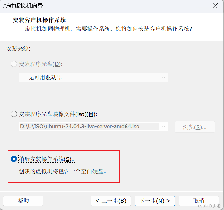 选择「稍后安装操作系统(S))」→ 点击「下一步」;