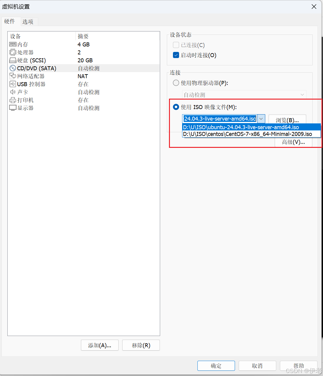 「双击配置: CD/DVD(SATA)」→ 虚拟机配置窗口