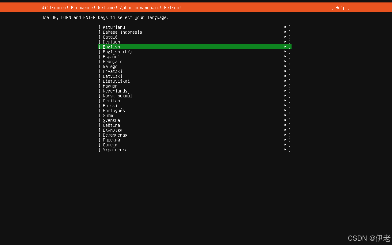 等待自动安装过程,一直到语言选择界面,选择语言:「English」→ 回车;