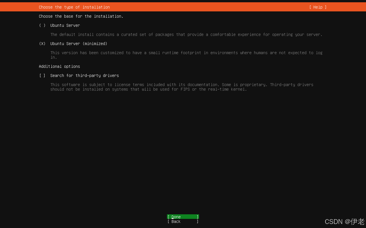 「Ubuntu Serve (minimized)」(最小化安装)→「Done」→ 回车;